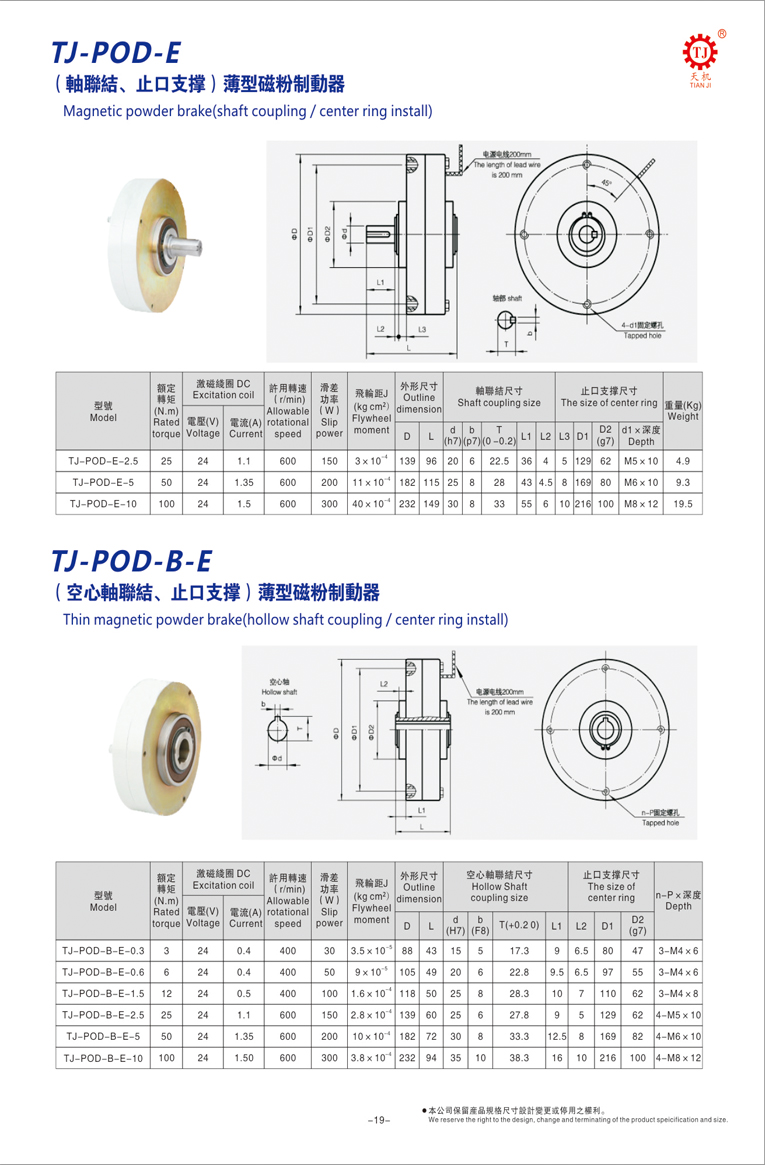 东莞天机传动厂家生产的空心轴薄型磁粉刹车器又称止口支撑薄型磁粉刹车器,额定转矩:3-100N.m;额定电压:DC24V;激磁线圈电流:0.4-1.5A。适用于放卷张力控制,磁粉刹车器还经常被用于传动机械的测功加载和制动等。